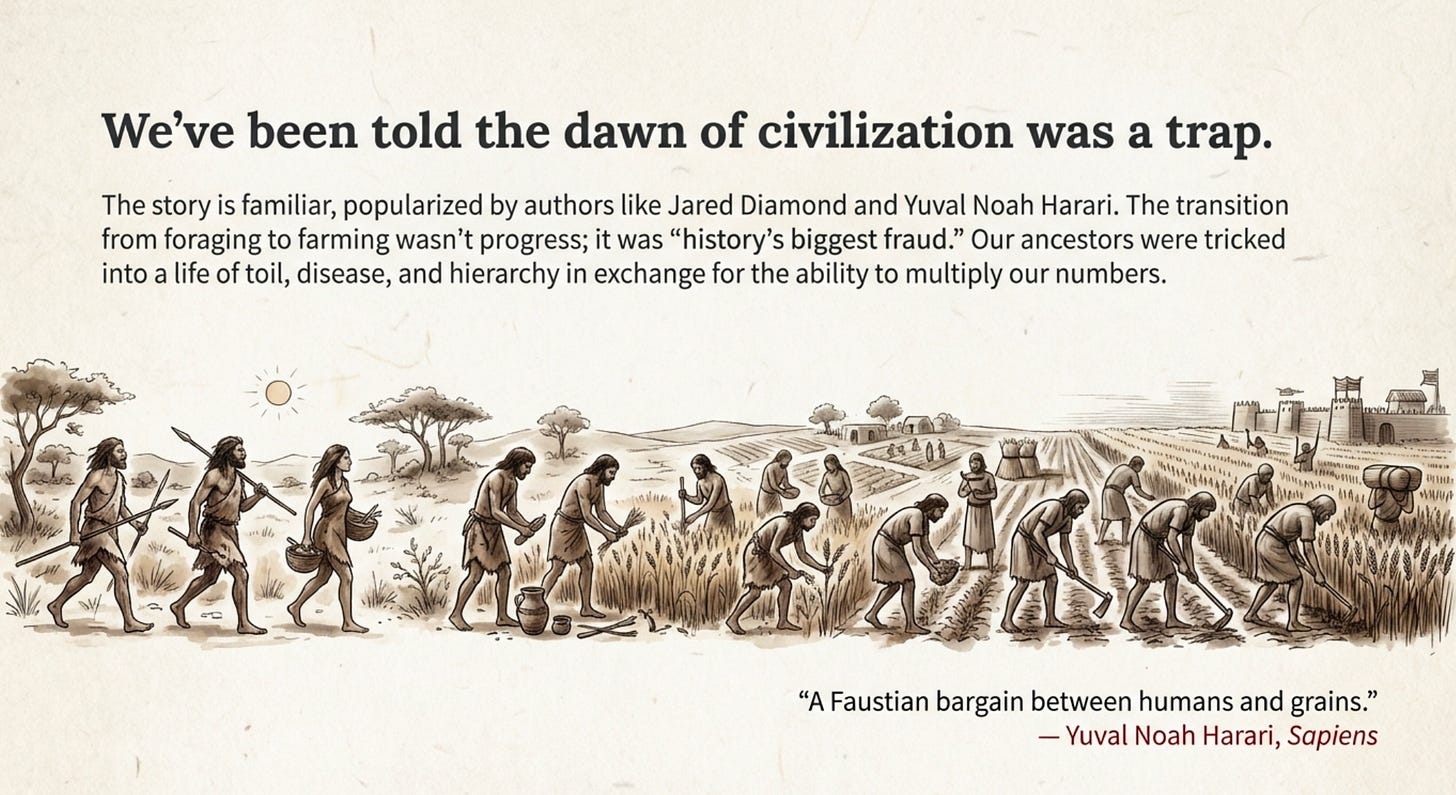 Many of those conversations, as you might imagine, have been oriented towards the future: when the Apple Vision Pro came out, we had a long debate about the future of spatial interfaces; books like Fully Automated Luxury Communism and Abundance prompted discussions about state capacity and Universal Basic Income; and of course the future of AI—its impact on the labor market, the possibility of sentient machines—has been a constant obsession even before I started working on NotebookLM. But just as many of the threads have debated the distant past, particularly the transition between our ancestral evolutionary environment of nomadic hunter-gatherers and the emergence of “modern” institutions like agriculture, cities, capital, and writing. An early trigger for this—almost a decade ago—had been the publication of Yuval Noah Harari’s Sapiens, which my friends had read enthusiastically, but which I had found underwhelming. In part I was disappointed with Sapiens because I had just published my book Wonderland, which argued for a foundational role for delight-driven curiosity in the human story that Harari had largely ignored. (My irritation with Harari may have also had something to do with the fact that he had sold approximately one billion more copies of his book than I had of mine.) The dawn-of-civilization theme remained active in our threads over the next few years; one member of the group was working on an inventive thesis about the origins of capital that often brought us back to the Bronze Age, and I was writing my book about longevity, Extra Life, which had a long section about the devastating impact that the adoption of agriculture had on human lifespan.
